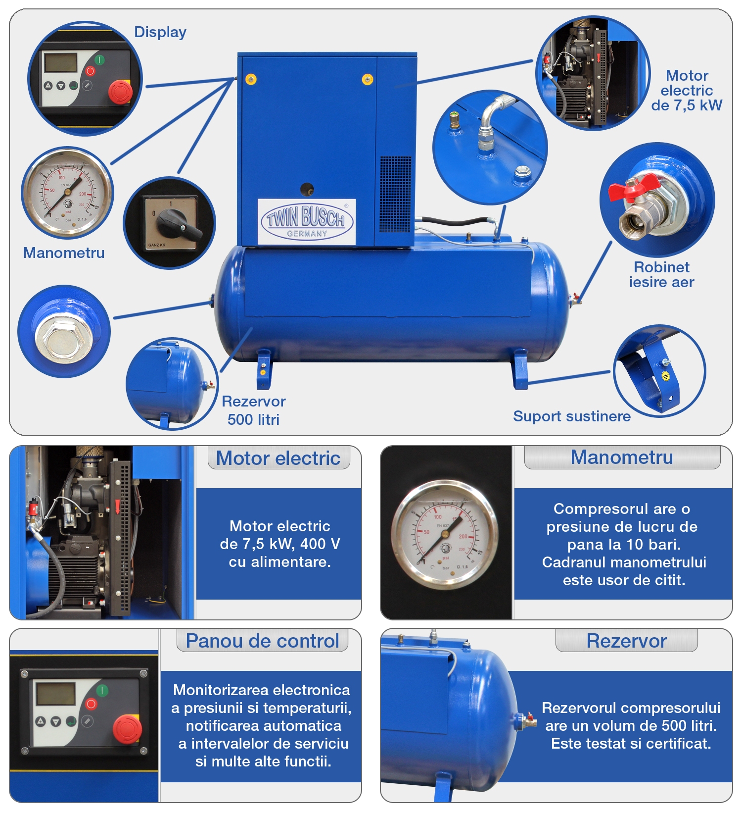 Echipat cu o supapă de sens, regulator de presiune cu comutator ON / OFF și protecție pornire motor. Supapă de siguranță, manometru, robinet de scurgere condens. Unitate de control cu functie economisire curent, monitorizare electronică a presiunii și temperaturii, notificari automate in intervale service, posibilitate programare compresor si inchidere automata in caz de urgenta.