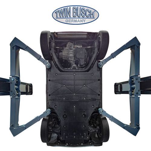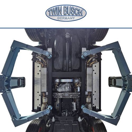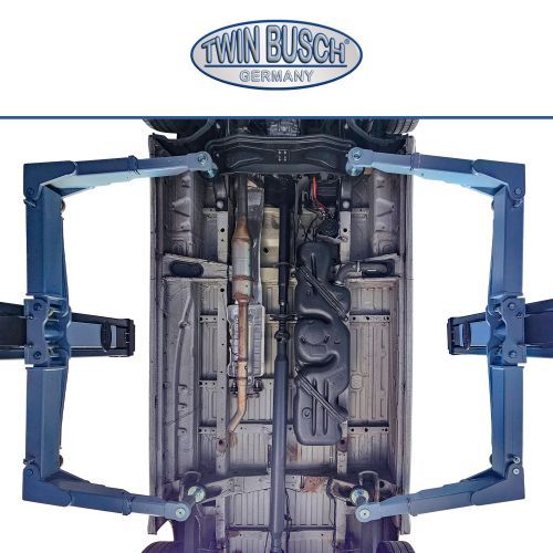 Vehiculele prezentate au fost ridicate folosind punctele de ridicare ale producătorului sau puncte alternative compatibile. Vă rugăm să acordați atenție adaptorilor speciali Twin Busch pentru a asigura o ridicare sigură, deoarece unele vehicule — īn special din clasa transportoarelor — nu dispun de puncte de ridicare similare celor de la autoturisme. Respectați īntotdeauna instrucțiunile și reglementările producătorului vehiculului. Respectați măsurile obișnuite de siguranță la ridicare și coborāre, distribuția corectă a sarcinii, sarcina maximă admisă și consultați manualul elevatorului.