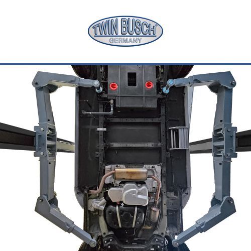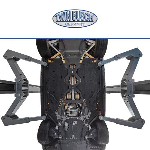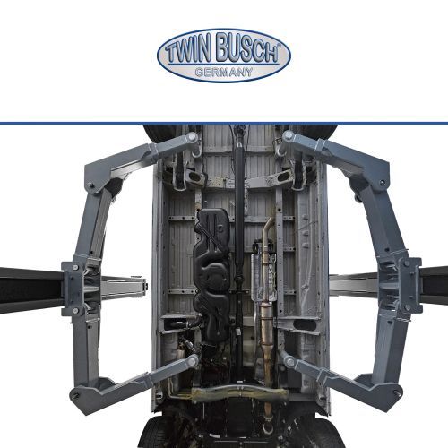 Vehiculele prezentate au fost ridicate folosind punctele de ridicare ale producătorului sau puncte alternative compatibile. Vă rugăm să acordați atenție adaptorilor speciali Twin Busch pentru a asigura o ridicare sigură, deoarece unele vehicule — īn special din clasa transportoarelor — nu dispun de puncte de ridicare similare celor de la autoturisme. Respectați īntotdeauna instrucțiunile și reglementările producătorului vehiculului. Respectați măsurile obișnuite de siguranță la ridicare și coborāre, distribuția corectă a sarcinii, sarcina maximă admisă și consultați manualul elevatorului.