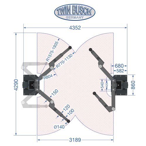 Elevatorul Heavy‑Line TW280W, cu o capacitate de ridicare de 8,0 t și brațe portante telescopice cu dublă articulație, īn design Brate-M modelul TW280W reprezintă cel mai puternic echipament din gama noastră de elevatoare cu 2 coloane.